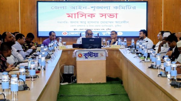 খুলনা বিভাগীয় ব্যুরো প্রধান। আজ রোববার কুষ্টিয়া জেলা প্রশাসকের কার্যালয়ের সভাকক্ষে জেলা আইনশৃঙ্খলা কমিটির মাসিক সভা অনুষ্ঠিত হয়েছে। এতে সভাপতিত্ব করেন জেলা প্রশাসক ও জেলা ম্যাজিস্ট্রেট আবু হাসনাত মোহাম্মদ আরেফীন।