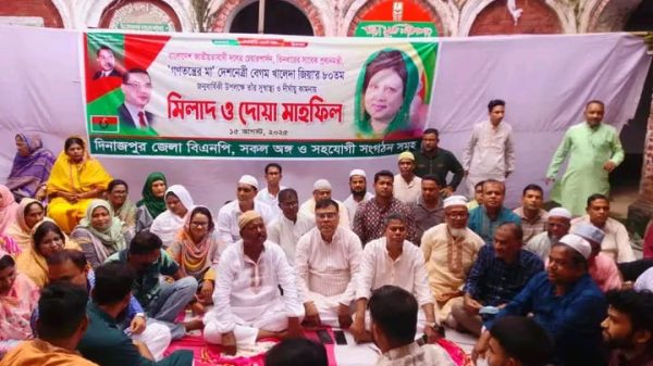 মো সালাম রাব্বানী দিনাজপুর প্রতিনিধি বাংলাদেশ জাতীয়তাবাদী দল (বিএনপি) চেয়ারপারসন ও তিনবারের সাবেক প্রধানমন্ত্রী বেগম খালেদা জিয়ার ৮০তম জন্মবার্ষিকী উপলক্ষে তাঁর সুস্বাস্থ্য ও দীর্ঘায়ু কামনায় দিনাজপুর জেলা বিএনপির উদ্যোগে মিলাদ