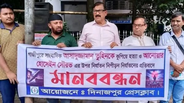 মো সালাম রাব্বানী দিনাজপুর প্রতিনিধি গাজীপুরে সাংবাদিক আসাদুজ্জামান তুহিনকে কুপিয়ে হত্যা এবং সাংবাদিক আনোয়ার হোসেন সৌরভের ওপর বর্বর নির্যাতনের প্রতিবাদে দিনাজপুরে মানববন্ধন কর্মসূচি পালন করেছে দিনাজপুর প্রেসক্লাব। শুক্রবার (৮ আগস্ট)