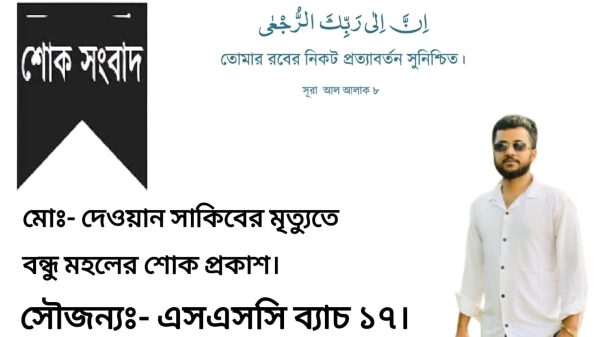 স্টাফ রিপোর্টঃ- মোঃ নাহিম দৈনিক দক্ষিণের অপরাধ সংবাদ । দেওয়ান সাকিবের মৃত্যুতে বন্ধু মহলের শোক প্রকাশ। সৌজন্যঃ- এসএসসি ব্যাচ ১৭। আমরা গভীর ভাবে দুঃখের সাথে জানাইতেছি যে, গতকাল ৫ সেপ্টেম্বর