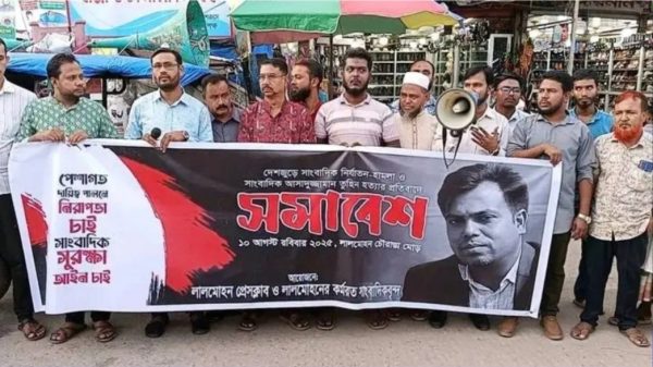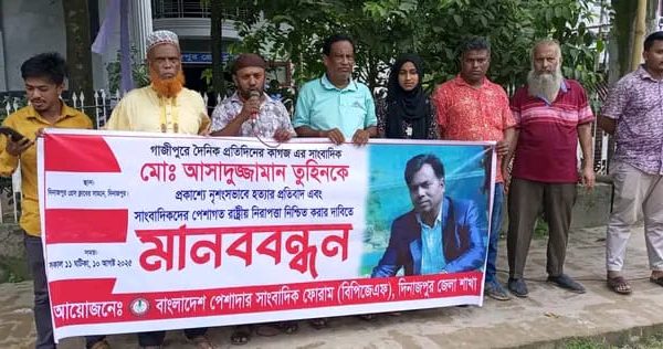 মো সালাম রাব্বানী দিনাজপুর প্রতিনিধি গাজীপুরে সাংবাদিক আসাদুজ্জামান তুহিনকে নৃশংসভাবে কুপিয়ে হত্যা ও সাংবাদিক আনোয়ারকে ইট দিয়ে গুরুতর আহত করার ঘটনায় জড়িতদের দ্রুত গ্রেফতার ও দৃষ্টান্তমূলক শাস্তির দাবিতে দিনাজপুরে মানববন্ধন