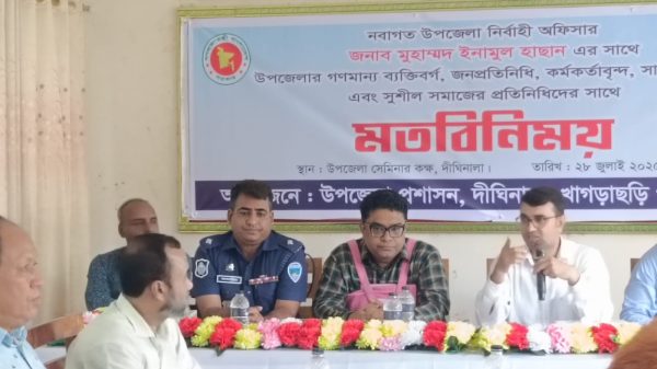 মোঃ নাছির উদ্দীন দীঘিনালা (খাগড়াছড়ি) প্রতিনিধি খাগড়াছড়ি পার্বত্য জেলার দীঘিনালা উপজেলায় নবাগত উপজেলা নির্বাহী অফিসার (ইউএনও) জনাব মোহাম্মদ ইনামুল হাছান-এর সঙ্গে মতবিনিময় সভা অনুষ্ঠিত হয়েছে। রবিবার (২৮ জুলাই) দুপুরে উপজেলা