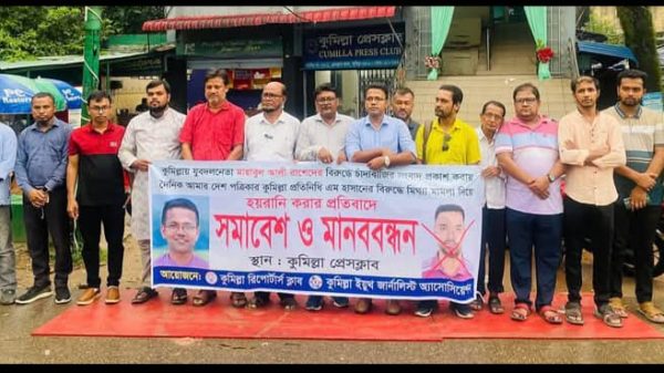 বাহাদুর চৌধুরী :১১/৯/২০২৫ কুমিল্লা জেলার বিশিষ্ট সাংবাদিক এম হাসানের বিরুদ্ধে দায়ের করা একটি ভিত্তিহীন ও উদ্দেশ্যপ্রণোদিত মামলার প্রতিবাদে ১০ই সেপ্টেম্বর ২০২৫ কুমিল্লা প্রেস ক্লাবের সামনে অনুষ্ঠিত হয় মানববন্ধন ও প্রতিবাদ
