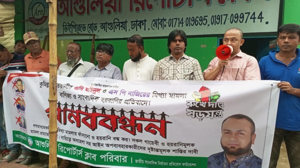 বিপ্লব চৌধুরী : বাংলাদেশ জাতীয় অপরাধ বিচিত্রার বিশেষ প্রতিনিধি এবং জাতীয় সাংবাদিক নির্যাতন প্রতিরোধ ফাউন্ডেশনের চেয়ারম্যান শাহিন আলমের বিরুদ্ধে কুমিল্লা জেলায় আইন-শৃঙ্খলা বাহিনীর ইন্ধনে দায়েরকৃত ৯/৬ মিথ্যা মামলার প্রতিবাদে আশুলিয়া