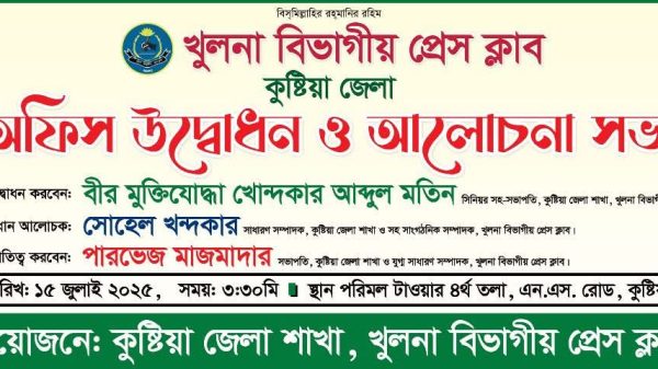 মোঃ আশরাফ ইকবাল পিকলু মাজমাদার যুগ্মসাধারণ সম্পাদক। গর্বের ও আনন্দের সাথে জানাচ্ছি, খুলনা বিভাগীয় প্রেস ক্লাব, কুষ্টিয়া জেলা শাখার অফিস উদ্বোধন ও আলোচনা সভা অনুষ্ঠিত হতে যাচ্ছে আগামী ১৫ জুলাই ২০২৫, বিকাল ৩:৩০ মিনিটে স্থান: পরিমল টাওয়ার (৪র্থ তলা), এন.এস. রোড, কুষ্টিয়া । 🔰 উদ্বোধন করবেন: বীর মুক্তিযোদ্ধা খোন্দকার আব্দুল মতিন সিনিয়র সহ-সভাপতি, কুষ্টিয়া জেলা