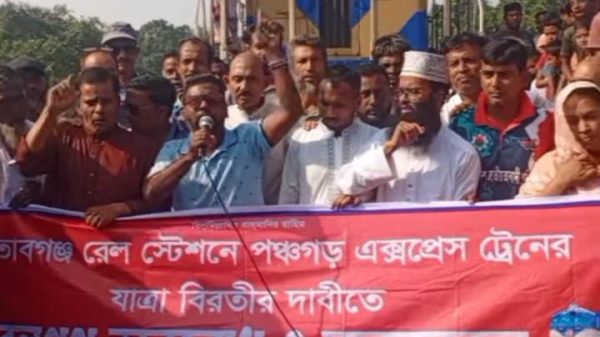 মোঃ আসাদ আলী বোচাগঞ্জ দিনাজপুর প্রতিনিধি শনিবার (৮ নভেম্বর) দুপুরে পঞ্চগড় এক্সপ্রেস ট্রেনটি সেতাবগঞ্জ স্টেশনে পৌঁছালে বিক্ষুব্ধরা প্রায় ১০ মিনিট ট্রেনটি আটকে রাখেন। এ সময় আয়োজিত কর্মসূচিতে বোচাগঞ্জ, কাহারোল, বিরলসহ আশপাশের এলাকার সামাজিক সংগঠনের নেতাকর্মী, ব্যবসায়ী, শিক্ষার্থী ও যাত্রী সাধারণ অংশ নেন। স্লোগানে মুখরিত এ কর্মসূচিতে অংশগ্রহণকারীরা দ্রুত যাত্রাবিরতি বাস্তবায়নের দাবি জানান। বক্তারা বলেন, সেতাবগঞ্জ